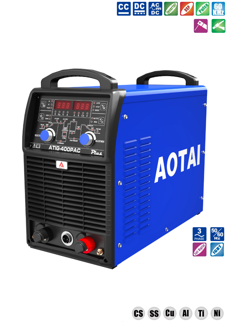 - Сварочный корпус 7 в 1: Поддерживает различные режимы сварки, включая AC TIG, DC TIG и MMA.